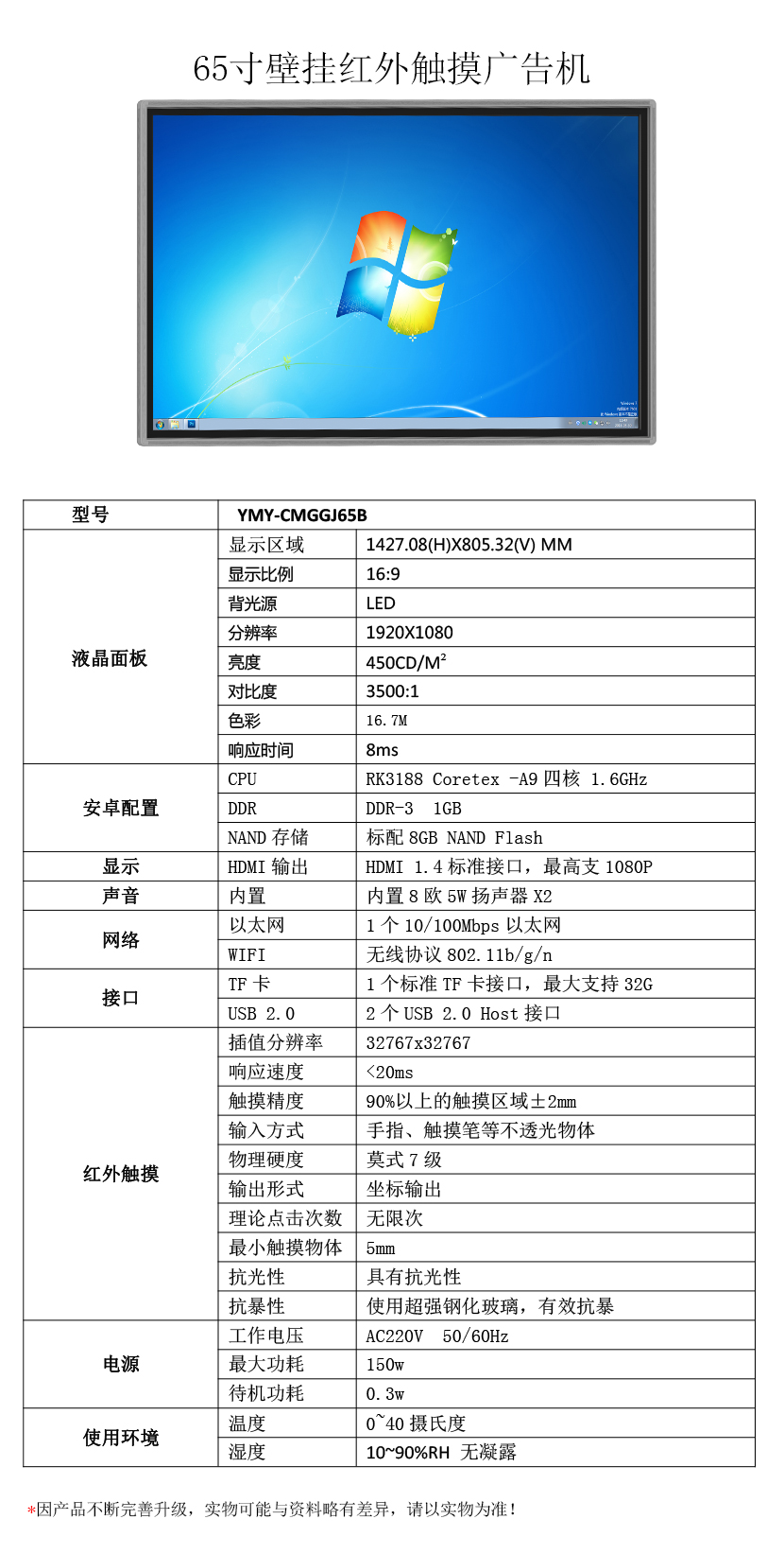 65寸紅外觸控壁掛廣告機(jī)